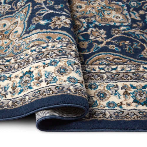 Elevate your living room, bedroom, or home office with the classic style of this oriental rug. It features a traditional style, with a central floral medallion surrounded by botanical motifs, all rendered in shades of ivory and beige on a vibrant navy blue background. This rug is power loomed in Turkey and is constructed of polypropylene with a jute backing and a medium pile height. We recommend a rug pad for additional comfort and stability.